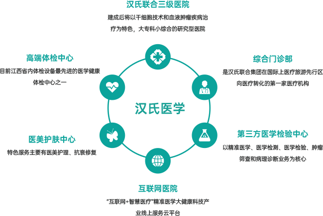 汉氏联合精准医学大健康项目是以干细胞再生精准医学为核心的新型健康服务平台,与汉氏联合三级医院、综合门诊部、健康体检中心、第三方医学检验中心、医美抗衰中心、互联网+医院、智慧养老中心等医疗和健康管理服务完美结合,在上饶国际细胞谷形成了再生医学大健康产业链闭环体系,为客户提供生命周期的一站式服务。
