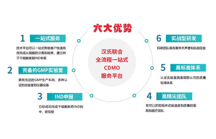 汉氏联合CDMO是基于汉氏联合干细胞与再生医学研究院具有CDMO业务需要的实验平台和专业团队的基础上派生的研发技术服务业务,是国内首个专注于干细胞CDMO的研究院。可以为企业提供创新性的工艺研发及生产服务,以高附加值技术输出取代单纯的产能输出,内容涵盖细胞工程技术、临床前研究开发、IND申报及临床研究、精准医学及其他合作研究。用领先的技术全面打造赋能平台,承载细胞药物造福人类健康之梦想。