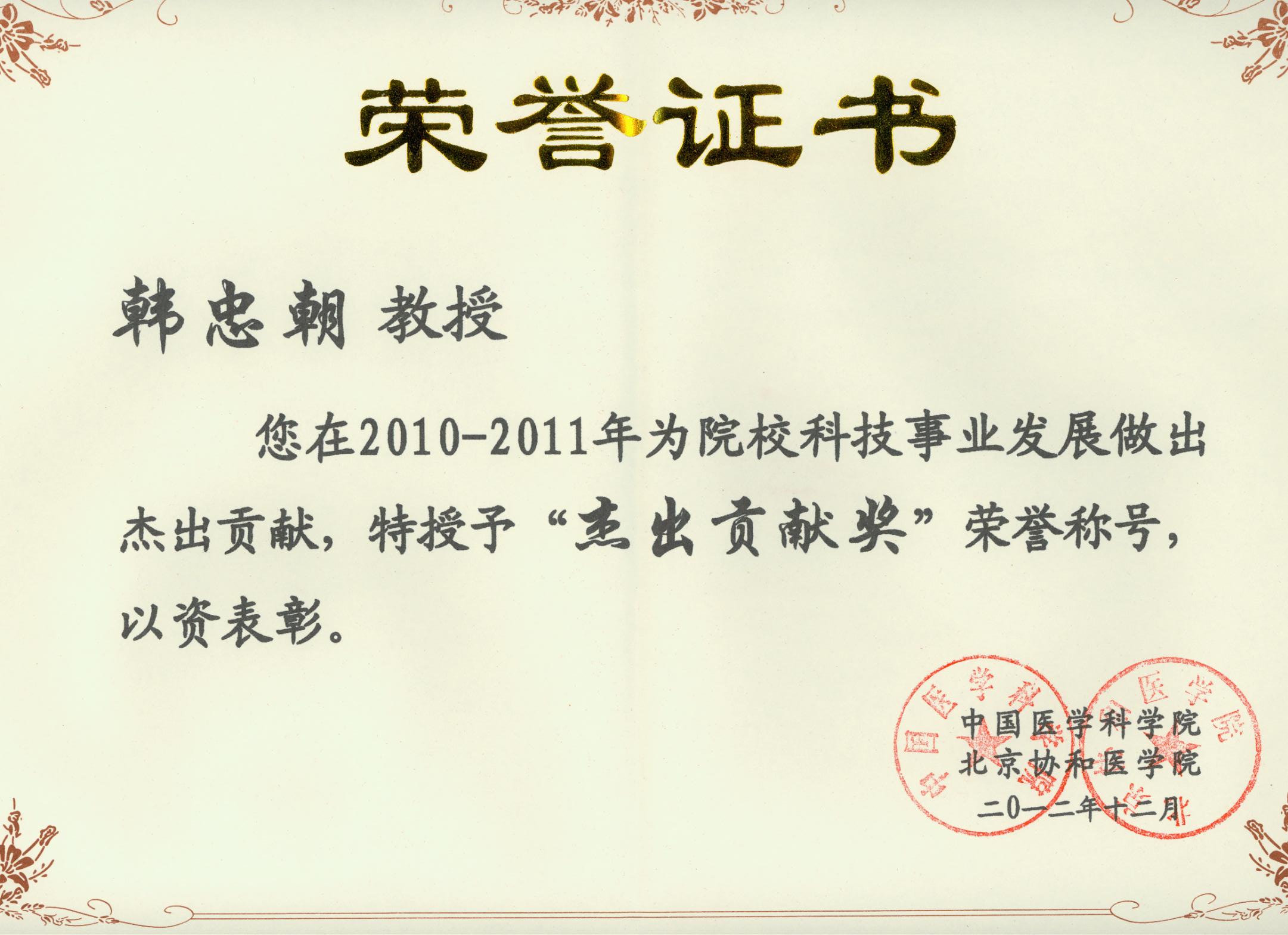 2012年12月13日,韩忠朝教授荣获中国医学科学院、北京协和医学院2010-2011年度杰出贡献奖,表彰他立足本职科研岗位,努力铺设架接干细胞科技经济桥梁,在干细胞基础研究、技术产业转化和临床应用的研究中所取得的成就。