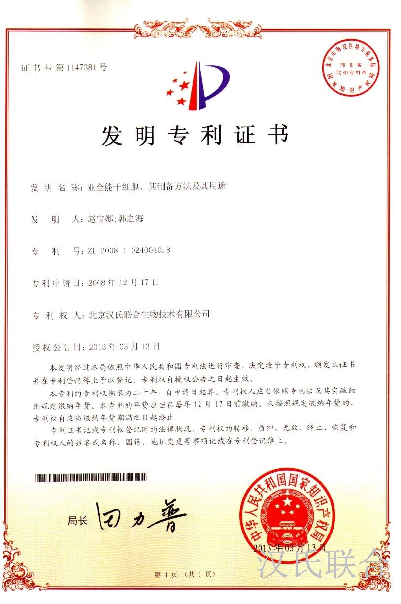 2013-03-13日,汉氏联合正式获得由国家知识产权局颁发的专利证书。发明名称:亚全能干细胞、其制备方法及其用途,专利号:ZL 2008 1 0240040.8。