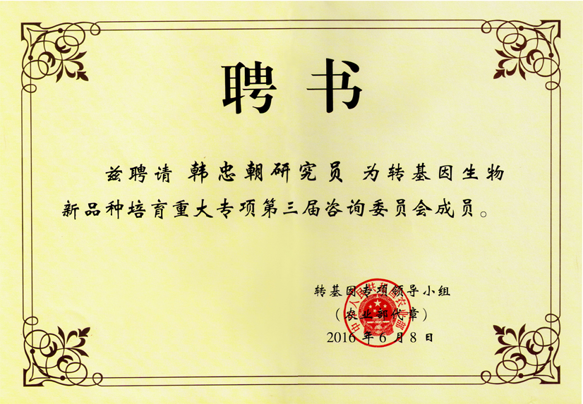 韩忠朝教授 受聘担任转基因生物新品种培育重大专项第三届咨询委员会成员