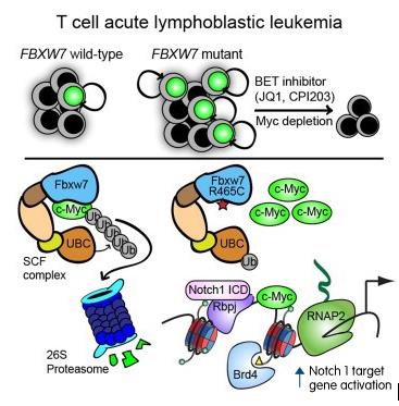 在试验中,研究人员将突变的Fbxw7等位基因分别转移到健康小鼠和白血病小鼠的造血干细胞中。发现在健康细胞中,突变Fbxw7 与Notch1只针对性地影响c-Myc(T-ALL的关键致癌基因)蛋白泛素化和半衰期,却不影响正常造血干细胞的功能。然而在白血病细胞中,细胞大量扩增。研究人员进一步发现Fbxw7结合并降解Myc蛋白,Myc蛋白为白血病干细胞提供能量,而当Fbxw7突变后,Myc不能被降解,于是癌症干细胞数目大量增加。