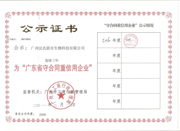 近日,汉氏联合全资子公司 广州汉氏联合生物科技有限公司 被广州市工商行政管理局授予2008年度守合同、重信用企业称号。