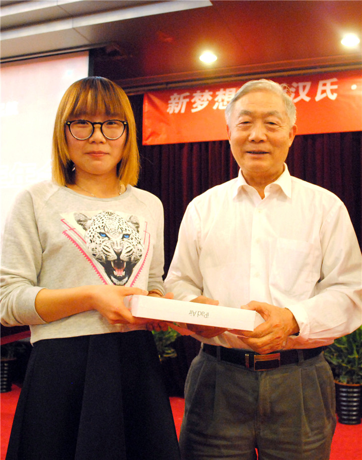董事长韩教授为一等奖获得者黄小丽颁奖并合影