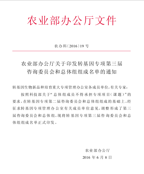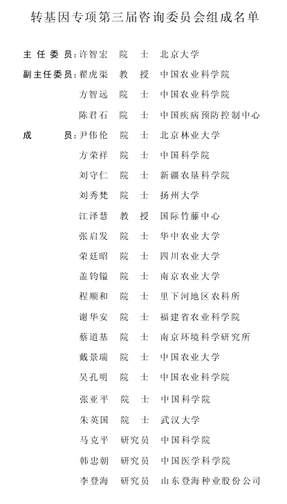 以下为农业部办公厅关于印发转基因专项第三届咨询委员会和总体组组成名单