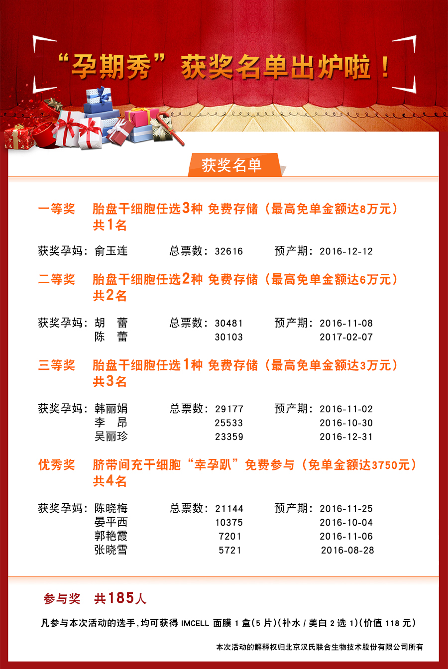 2016年8月1日至8月31日,为期1个月的汉氏联合全国首届“孕期秀”活动圆满落下帷幕。来自全国各地的10名幸孕妈咪从185名参赛选手中脱颖而出,成功为全家赢得干细胞存储万元免单大奖。