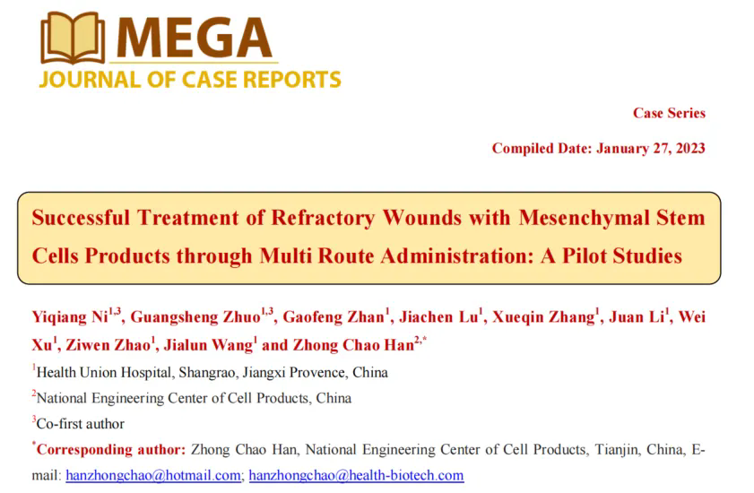汉氏联合科研团队在国际期刊《Mega Journal of Case Reports》上发表了关于干细胞疗法治疗难治性创面的研究论文,讲述了采用干细胞技术成功治愈3种不同原因造成的难治性创面。2018年11月至2022年3月期间,汉氏联合医院接收了三名慢性难治性伤口患者,年龄从10岁到55岁,这三位患者因不同病因导致伤口难以愈合,在其他医院接受了3-10个月的常规伤口治疗,均未愈合,其中两名患者被医生建议截肢。根据病患情况,汉氏联合医院制定了干细胞联合治疗方案,利用注射用脐带间充质干细胞(UC-MSCs)、胎盘间充质干细胞凝胶(P-MSCs水凝胶)对患者进行治疗,取得了显著效果,创面实现完全愈合。