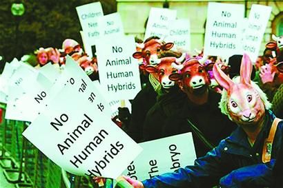 “对很多人而言,人与动物的混合就像是噩梦。想象一下,假如一只青蛙的身子上长了颗人头,又或者一只猴子的喉咙里长了人的声带,你就会明白一些 人为什么竭力要给所有跨物种细胞实验踩刹车。”美国《洛杉矶时报》用这番话表达了对一些人担心人兽胚胎实验安全性的理解。英国医学科学院工作组在报告中将 这种担忧称为“弗兰克斯坦恐惧”。工作组成员鲍德温说,如果科学家有一天将人类脑细胞移植到灵长类的大脑中,有可能令后者突然具有一些人类独有的能力和特 性,比如语言。虽然这种可能性目前仅存在于科幻小说中,但不得不令人担忧。“客迈拉”,这是希腊神话中一只有狮头、羊头和蛇尾的吐火怪兽。科学家把它引申 到医学领域,正是对人兽杂交胚胎“长大”后的形象借喻。据《每日邮报》介绍,2008年英国颁布《人类授精与胚胎学法案》时,将合法人兽胚胎实验分为3 类,最高程度的人兽杂交英文叫Hybrid,是指用人的精子给另一种动物的卵子授精;第二种实验正以“客迈拉”为名,指把人类胚胎细胞与动物胚胎细胞混 合,共同促成一个完整的胚胎,两种细胞的DNA不会混杂,理论上有可能生出兽面人身的“怪物”;第三种英文叫Cybrid,又称胞质杂交,是指先从动物卵 细胞中取出细胞核,再把人的细胞核移植进去,代替原来的动物细胞核。鲍德温警告说,英国实验室进行的实验“不是科学上的进步,而是人类自我毁灭的前奏”。