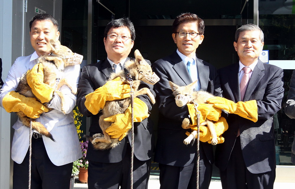10月17日,在韩国京畿道野生动物救助中心,韩国科学家黄禹锡(右一)将一只克隆郊狼送给京畿道知事金文洙(右二)。