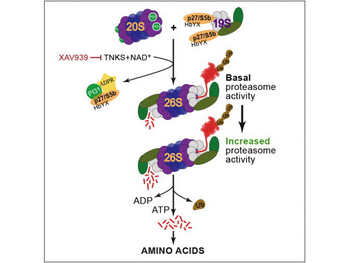 这项最新研究证实一种称作TNKS (ADP-ribosyltransferase tankyrase )的酶调控了蛋白酶体的活性。此外,最初由诺华(Novartis)开发出来治疗结肠癌的一种小分子XAV939可以抑制TNKS,阻断蛋白酶体的活性。