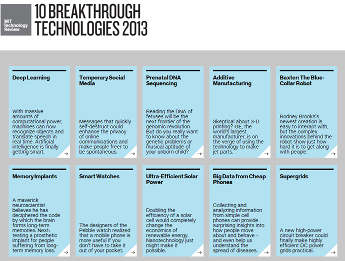 MIT表示今年预测评定的准则是:能带给人们运用于生活中的强大先进新技术。以下是符合麻省理工学院在2013年评选的突破创新科技: