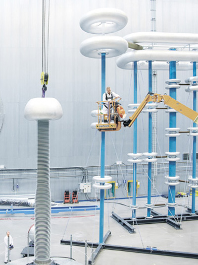 瑞士的ABB大型电力及自动化公司,所制造的“交、直流混合输电断路器”(中间,圆顶长柱状物)(The hybrid HVDC breaker)。