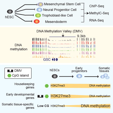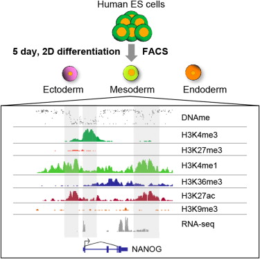 研究人员利用全基因组重亚硫酸盐测序技术,并结合染色质免疫沉淀测序方法,以及RNA测序方法,揭示了与每个胚层细胞系特异性有关的中的特殊事件。在假设远 端调控元件中出现了一些显而易见的DNA甲基化和H3K4me1谱系特异性变化,而这些元件均频繁的与未分化人类胚胎干细胞中多能性因子结合在一起。
