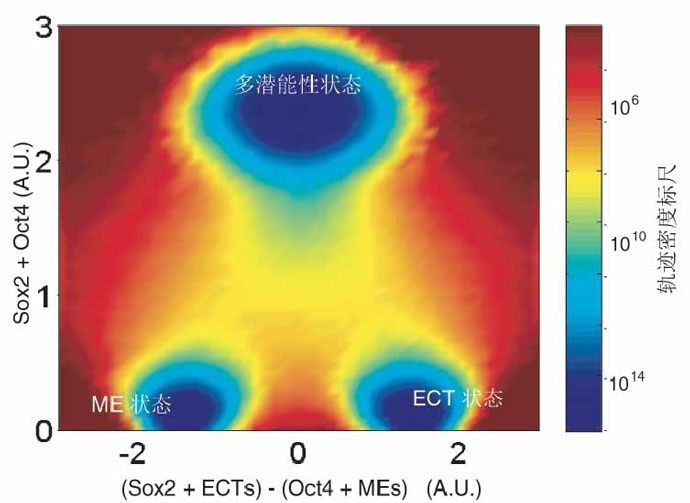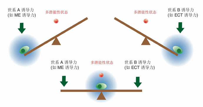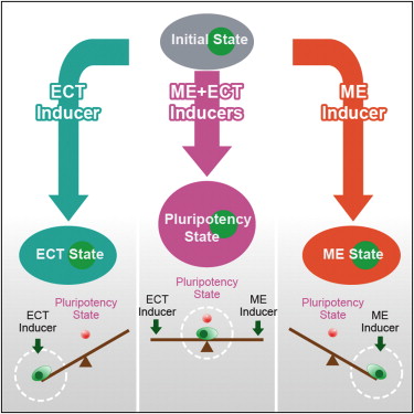 然而邓宏魁研究组通过大规模筛选发现,细胞重编程中至关重要的干性因子OCT4能够被调控中内胚层(ME)发育和分化的因子(如 GATA3,GATA6,PAX1)代替;SOX2能够被调控外胚层(ECT)发育和分化的因子(如GMNN)代替。进一步,汤超研究组根据这一发现创新 性地建立了“跷跷板模型”,来更好的理解中胚层基因和外胚层基因在重编过程中的相互抑制和相互平衡的关系,这种关系可能决定了细胞命运的维持和改变。这个 模型提供了诱导体细胞重编程的其它方法的预测,甚至还有一个出乎意料的模拟结果:如果同时过表达中内胚层和外胚层基因,就可以达到平衡从而同时替代 SOX2和OCT4。而我们的实验结果也进一步证实了这个可能,首次实现了用ME分化因子和ECT分化因子同时替代掉了细胞重编程过程中最关键的两个干性 因子OCT4和SOX2。这一发现改变了向目标细胞状态的转变需要用在目标细胞状态中高表达的因子的诱导的这一传统观点,为研究细胞命运转变提供了新视 角,重新认识了细胞重编程和细胞命运决定的机制。