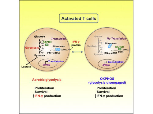 在增殖启动后,T细胞可以利用任何一种能量生成过程来维持自身。但当科学家们迫使T细胞从有氧糖酵解切换到氧化磷酸化时,出现了一个问题。研究人员表示,当 糖酵解关闭时,参与糖酵解的一些蛋白并没有消失——它们是相当稳定的蛋白,因此它们能够留在细胞中参与其他的过程。由于其中的一种蛋白GAPDH能够抑制 γ-干扰素生成,这可能导致T细胞出现问题。