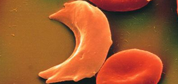 镰状细胞贫血病者的血液红细胞表现为镰刀状,其携带氧的功能只有正常红细胞的一半。这是一种常染色体隐性遗传病,由于β球蛋白基因突变而导致红细胞从柔韧的圆形变成僵硬的镰形。正常红细胞能轻松地穿过最细的毛细血管,携带氧气到达肺、肝脏、肾脏等器官。但是镰形的红细胞结构僵硬,在通过毛细血管时会受阻。目前的治疗措施主要是将供者的造血干细胞移植到患者体内,但通常会引起严重的排斥反应,只有小部分症状十分严重的儿童进行了移植治疗。