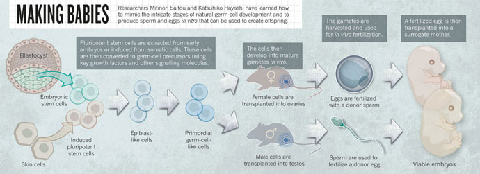 这些请求开始于 Hayashi 一篇文章的发表——他原以为只有发育生物学家才会对他的实验结果感兴趣。在体外条件下,利用小鼠的皮肤细胞创造可以发育成精子和卵子的原始生殖细胞( PGCs )。为了证明这些实验室培养的原始生殖细胞与自然发育而成的原始生殖细胞类似,他利用它们生成了卵子,进而创造小鼠生命。他表示,这个创造出来的小鼠生命 仅仅是他研究的一个“副产品”,他的研究将意味着更多——利用不孕妇女的皮肤细胞为她们提供可受精的卵细胞。与此同时他还提出,男性的皮肤细胞也可以用来 创造卵子,同样,女性的皮肤细胞也可以生成精子。(事实上,研究结果发表后,许多同性恋发邮件给 Hayashi ,索要更多的信息。)