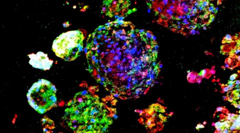图中为生长于培养的肺球体中的肺干细胞(绿色和红色)