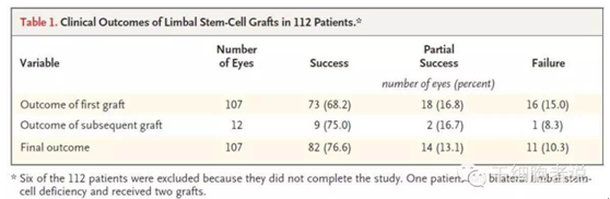 在2010年,N Engl J 杂志发表了一篇文章《Limbal Stem-Cell Therapy and Long-Term Corneal Regeneration》[4],意大利研究人员用病人自身角膜缘干细胞治疗角膜损伤。在患者的眼白和角膜间的异组织边缘提取干细胞,待其发育为纤维组织后,再植入患者的眼睛受损部位。112名被化学灼伤而导致失明的患者进行治疗,结果超过四分之三的患者恢复了视力。该技术一次移植成功率为68.2%,二次移植成功率为75%,还有13.1%患者的视力获得部分改善,仅有10.3%的患者视力无法获得改善。(如表1.)该研究发现P63阳性细胞比例对于治疗成功很重要。