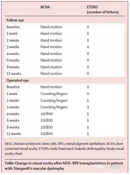 2010年,美国ACT公司(advanced cell technology)获得FDA许可,利用胚胎干细胞衍生的视网膜色素上皮细胞(RPE)对治疗两种退行性眼疾病:干性年龄相关性黄斑变性(Dry age-relatedmacular degeneration,AMD)和少年型黄斑营养不良(Stargardt病)。这是FDA批准的涉及到源自人类胚胎干(hES)细胞的第二项临床试验。2012年,该研究机构在《柳叶刀》(The Lancet)杂志发表了一篇文章《Embryonic stem cell trials for macular degeneration: a preliminaryreport》[5],美国研究人员利用人类胚胎干细胞(hESC)治疗了两名患有不同退化性眼疾病的患者,初期数据表明hESC治疗不仅安全,且显示出了一些治疗效力。他们将hESCs诱导生成了早期骨细胞和神经组织细胞,随后这些细胞分化形成了视网膜上皮细胞,其纯度超过99%。研究人员将大约5万个分离出来的视网膜上皮细胞注入到两名患者的视网膜下,其中一名老年女患者在其70多岁时患上了干性年龄相关性黄斑变性,而另一名中年女患者则患有少年型黄斑营养不良,因而导致了二者失明。4个月后,研究人员发现RPE已被注入的视网膜上皮细胞完全取代,数据证实注入的细胞存活了下来,并很大程度上改善了她们的视力。(如表2.)